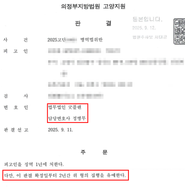 병역법 위반은 생각보다 선처를 잘 해주지 않아 제대로 대응하지 않으면 충분히 실형을 받을 수도 있는 혐의인데요, 이 사실을 잘 알고 있었던 굿플랜은 여러 양형 사유들을 모아 검찰과 법원 쪽에 선처를 구하였습니다.