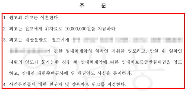 위자료 1,000만 원, 재산분할 및 양육권 인정