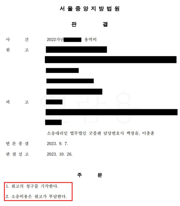 이에 따라 재판부는 굿플랜의 주장을 모두 인용해 주었고, 상대방이었던 원고의 청구를 모두 기각함과 동시에 소송비용 역시 원고가 부담하라는 판결을 내렸습니다.