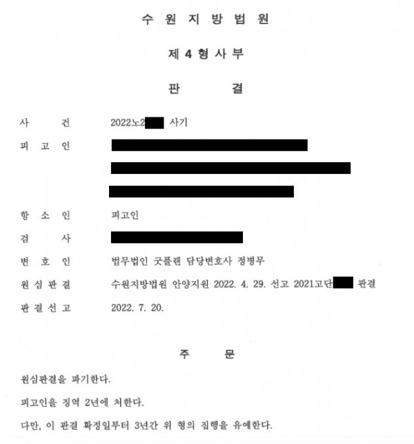 [사기] 징역 2년 원심파기, 집행유예 선고