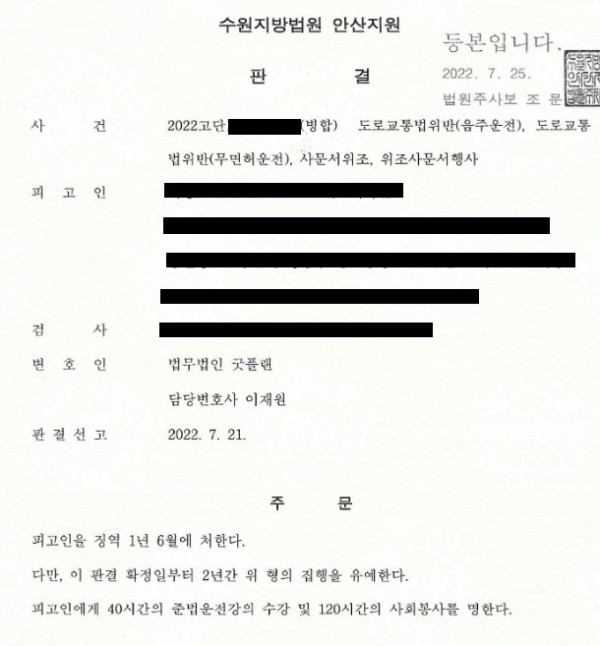 [무면허 음주운전, 위조사문서행사] 집행유예 선고
