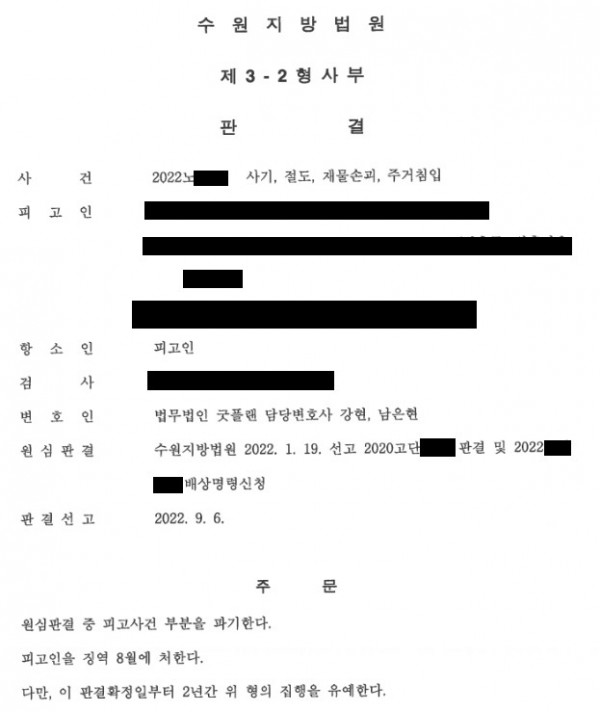 [사기, 절도, 재물손괴, 주거침입] 원심파기, 집행유예 선고