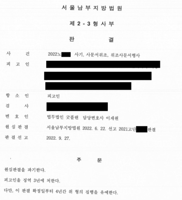 [사기, 사문서위조, 위조사문서행사] 징역 3년 원심 파기, 집행유예 선고