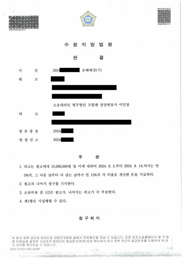 재판부는 의뢰인과 굿플랜의 주장을 받아들여주어 피고에게 위자료 1천 5백만원을 지급하라고 선고하였습니다.