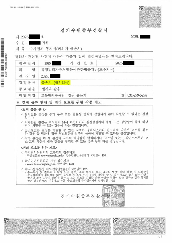 이에 경찰 측은 특정범죄가중처벌등에관한법률위반(도주치상)에 대해 불송치(혐의 없음) 결정을 내려주었습니다.