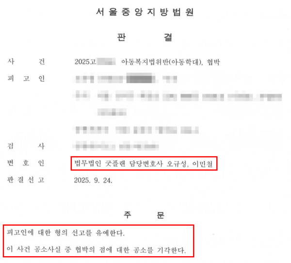 [아동학대 및 협박] 아동학대 선고유예, 협박 무죄