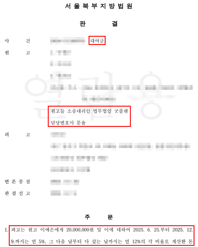 굿플랜은 피고가 돈을 갚겠다고 한 여러 증거들을 통해 대여금이라는 점을 확실하게 보여주었고, 법원은 굿플랜과 의뢰인의 청구를 받아주었습니다.