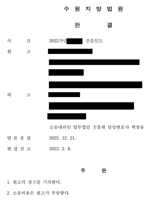 본 소송의 상대방이었던 원고는 의뢰인과 임대차 계약을 체결하였고, 정한 계약기간 2년이 지났으며 본인들이 본 건물을 사용할 것이니 건물을 인도해야 한다는 취지로 건물인도를 청구하였습니다.