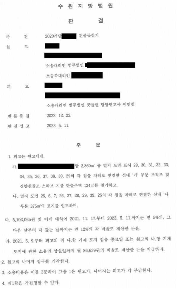 이에 굿플랜의 변호인은 의뢰인이 20년이 넘는 기간 동안 자유 점유의 의사로 점유를 개시하였으며, 20년이라는 긴 시간 동안 평온 · 공연하게 점유한 것을 주장하였습니다. 결국 재판부는 의뢰인의 소유권을 인정해 주었으며, 원고의 나머지 청구는 기각하였습니다.