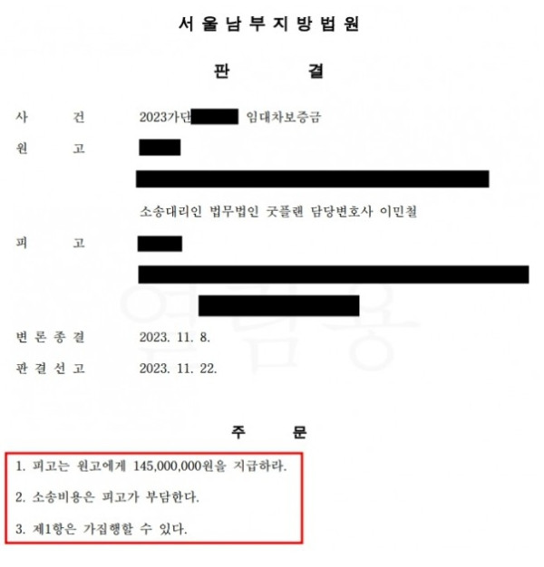 이에 재판부는 굿플랜과 의뢰인의 손을 들어주어 피고는 의뢰인에게 보증금을 지급함과 동시에 소송비용 역시 피고가 부담하라 하였습니다.