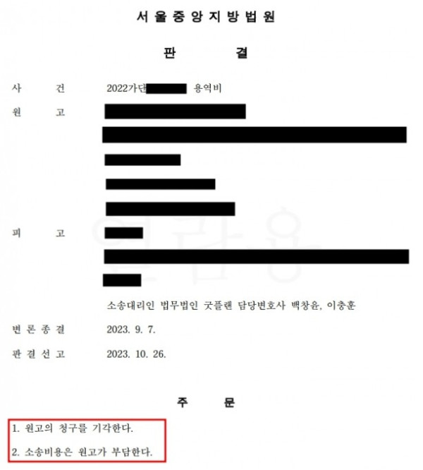 이에 따라 재판부는 굿플랜의 주장을 모두 인용해 주었고, 상대방이었던 원고의 청구를 모두 기각함과 동시에 소송비용 역시 원고가 부담하라는 판결을 내렸습니다.