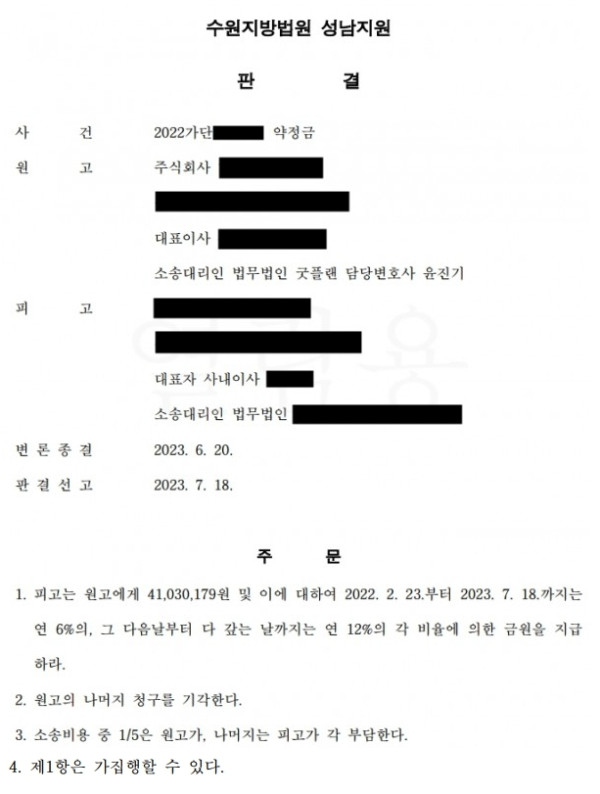 의뢰인은 약정금 소송의 원고였으며, 피고와는 동업관계였습니다. 두 사람은 사업을 분할하게 되었고, 서로의 계약상 지위를 침해하면 각 거래처에 대하여 5년간의 매출액에 상응하는 금액을 배상하기로 하였습니다.
