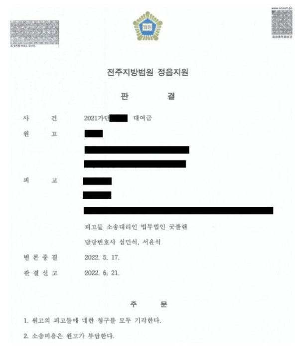 결국 법원은 굿플랜의 주장을 모두 인용해 주었고, 원고의 모든 청구를 기각시켰으며 소송비용 역시 원고가 모두 부담하라라는 판결을 내리게 되었습니다.