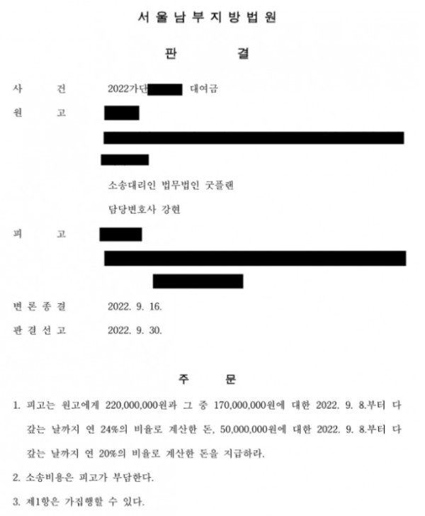 이러한 주장들을 받아들인 재판부는 굿플랜과 의뢰인의 모든 청구를 인용해 주었으며, 의뢰인은 대여금을 다시 돌려받을 수 있게 되었습니다.