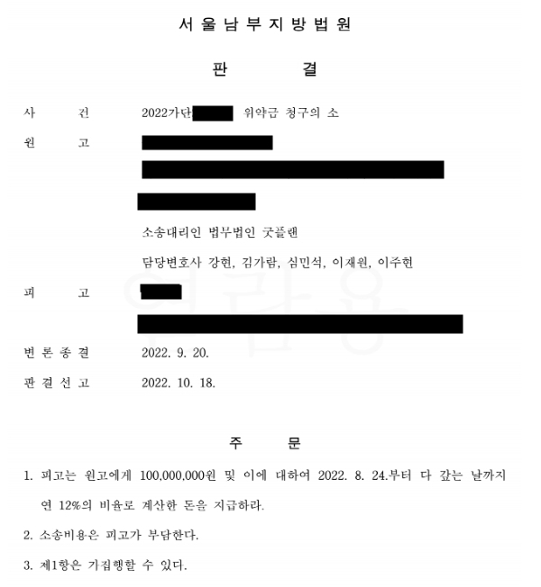 하지만, 친동생 또한 '피고와 알아서 하라'라고 했으며, 이에 굿플랜과 의뢰인은 약정금 청구 소송을 진행하게 되었습니다. 굿플랜은 계약서를 토대로 보증금과 함께 위약금도 줘야 한다고 주장했으며, 법원은 이러한 주장을 모두 받아주어 굿플랜과 의뢰인의 모든 청구를 인용해 주었습니다.