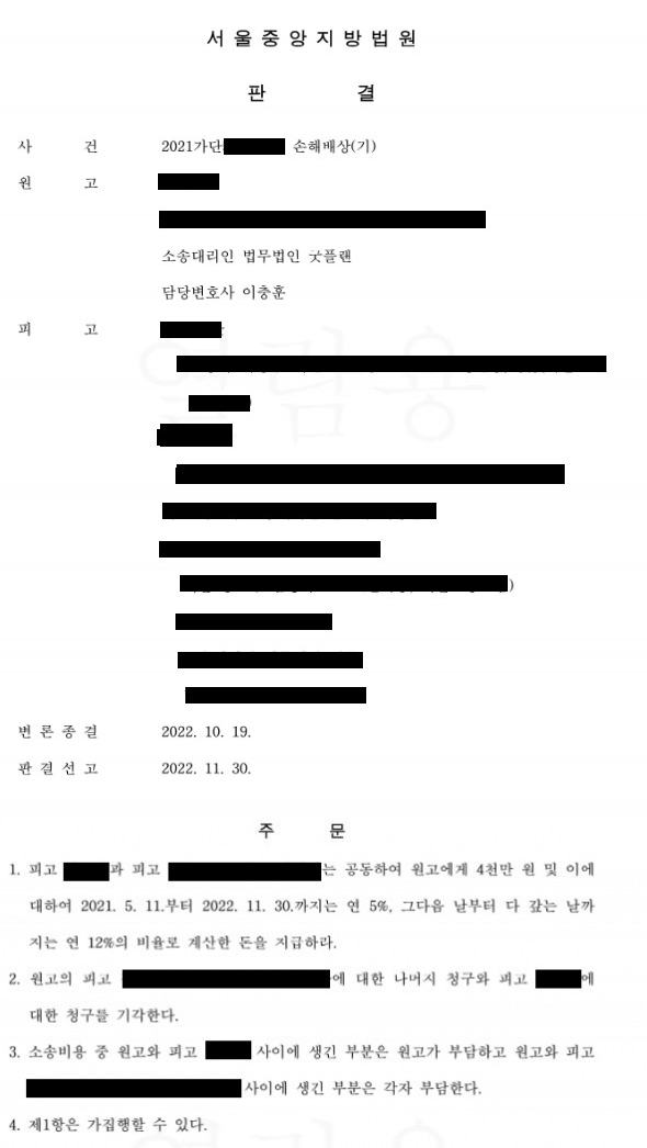 이러한 굿플랜의 주장들을 통해 의뢰인은 청구한 금액에 근접한 손해배상액을 받을 수 있게 되었으며, 큰돈을 잃을 수 있었던 상황에서 빠져나올 수 있게 되었습니다.
