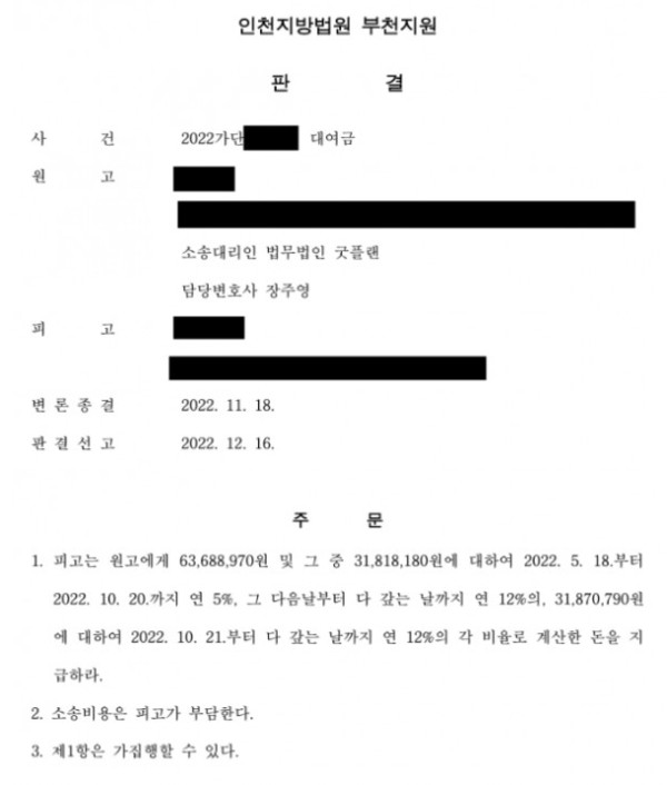이에 법원은 굿플랜의 주장을 모두 받아주었으며, 피고에게 대여금과 손해배상금까지 배상하라는 판결을 내리게 됩니다.