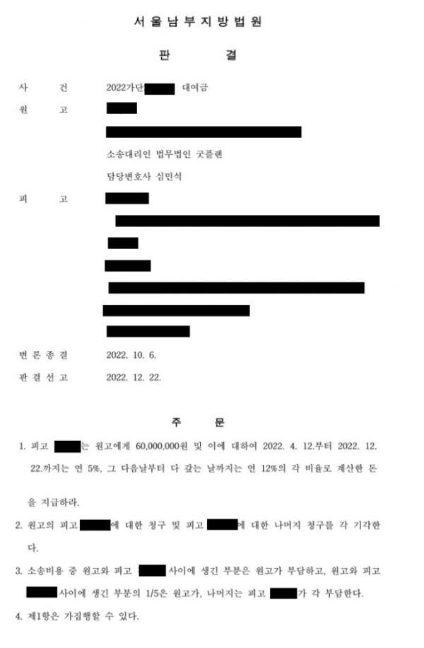또한, 피고는 원금 일부를 변제한 점을 항변하였지만, 이에 대해 굿플랜은 빈틈없이 반박을 하였으며, 결과적으로 재판부는 대여금의 대부분이었던 6,000만 원을 인용해주어 의뢰인의 억울함이 풀어질 수 있었습니다.