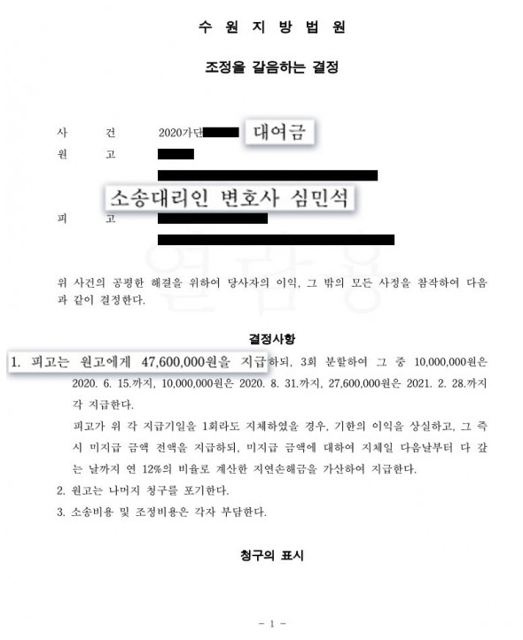부동산 가압류로 이해서 자금 융통이 완만하게 이뤄지지 않게 되자, 채무자측에서 먼저 조정신청을 통해서 대화를 시도했고, 굿플랜과 의뢰인은 분할로 지급 받을 수 있도록 조정하여, 재판부로부터 결정문을 받음으로써, 본 사건을 비교적 짧은 시일에 완만하게 종결할 수 있었습니다.