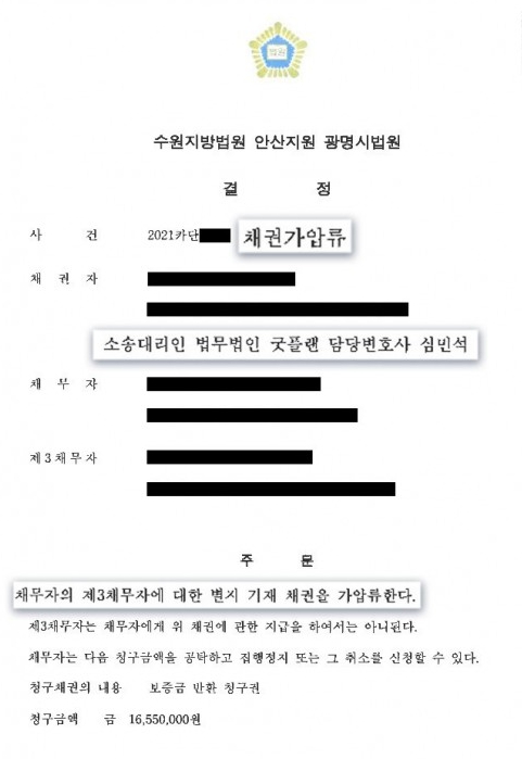 굿플랜은 의뢰인을 대신 하여 채권가압류 결정을 청구하였습니다.