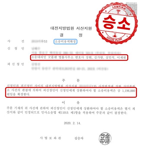 로펌 굿플랜은 신청인을 대리하여 소송비용액의 확정 신청을 대리하였습니다.