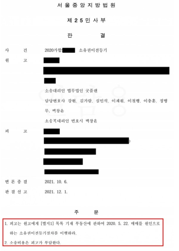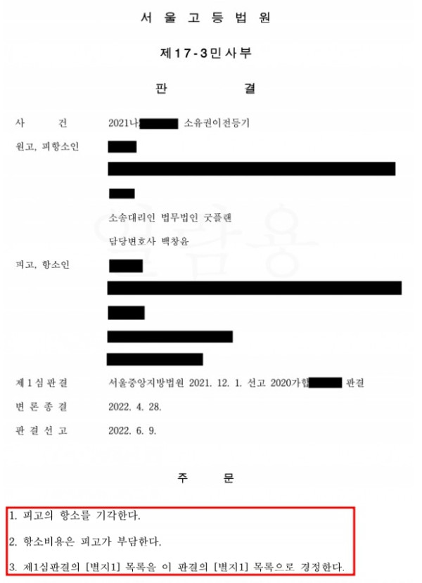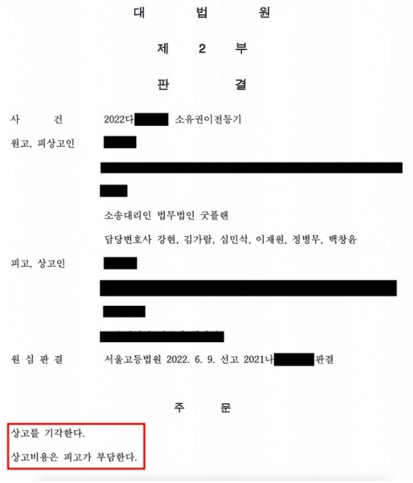 이러한 빈틈없는 주장들을 받아들인 재판부는 피고에게 이전등기절차를 이행하라 하였고, 이에 불복한 피고는 항소심과 상고심까지 진행하였지만 굿플랜에게 모두 패소하여 결국 의뢰인의 권리는 지켜질 수 있게 되었습니다.