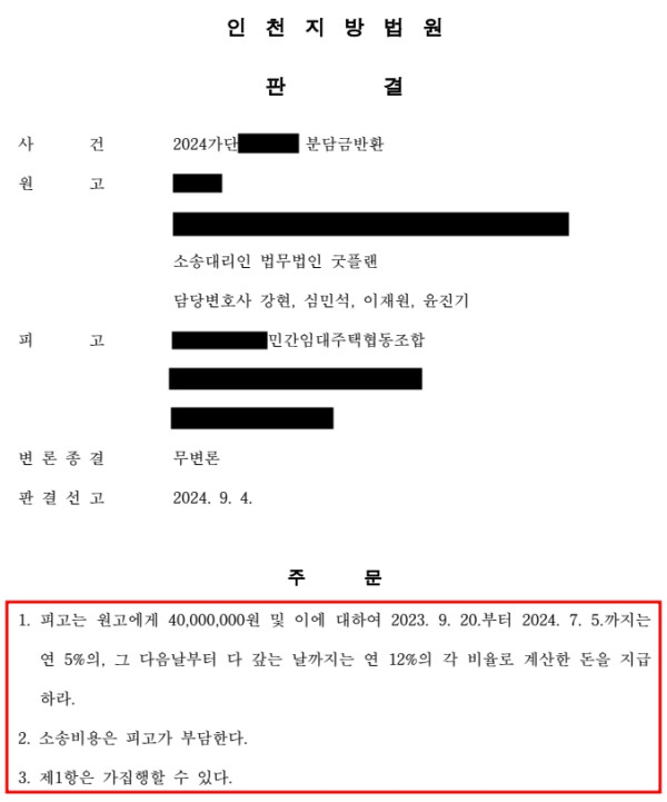 이러한 설득력 있는 주장을 받아들인 재판부는 모든 청구를 인용해 주어, 피고에게 분담금을 지급하라 하였고, 소송비용 역시 피고가 부담하라는 판결을 내려주었습니다.