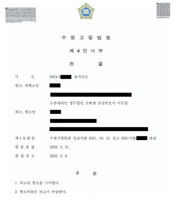본 소송은 상대방이 토지인도소송에 대하여 항소를 한 상황이었으며, 1심에서는 둘 사이의 계약은 상대방의 차임 미지급 전대차기간 만료를 원인으로 한 의뢰인의 해지 의사표시에 의하여 적법하게 해지된 것이고, 이에 따라 상대방은 의뢰인에게 본 사건 토지를 인도할 의무가 있으며, 차임 상당액도 지급해야 한다는 판결이 나왔습니다.