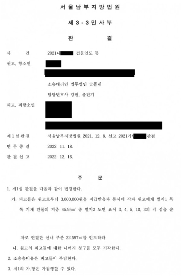 의뢰인은 건물의 임대인이었으며, 임차인(피고)들과의 분쟁으로 건물인도소송을 진행하게 되었으며, 1심에서 패소하여 굿플랜과 함께 항소를 준비하였는데요. 먼저 굿플랜은 임대차계약과 관련한 제반 사정에 대한 사실오인 및 법리오해가 있었음을 주장하며, 항소이유서를 제출하였고, 최대한 2심에서 의뢰인이 건물인도를 받으실 수 있도록 노력하였습니다.