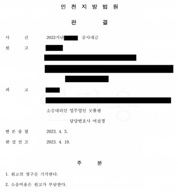 또한, 원고가 굿플랜과 의뢰인 측이 주장한 금원에 대해 세금계산서를 직접 발행해 주었다는 것을 보여주었으며, 모든 공사대금을 변제했다는 것을 영수증 및 입금내역 등을 통해 보여주었습니다. 결국 미지급한 금원이 없다고 판단한 법원은 상대방 측인 원고의 모든 청구를 기각하였고, 소송비용을 원고가 부담하게 하였습니다.