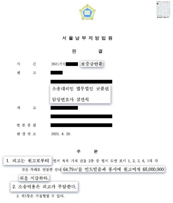 굿플랜은 임차인인 원고를 대리하여 임대인을 상대로 임대차보증금의 반환을 청구하였습니다.