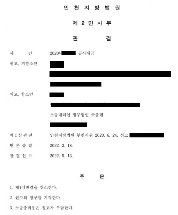 또한, 원고가 제출한 증거를 보아도 전혀 이유가 없다는 것을 보여주었으며, 의뢰인이 모든 공사대금을 계약서에 맞게 지급한 것임을 보여주었습니다. 이에 법원은 1심 판결을 취소하였고, 원고의 모든 청구를 기각함에 따라 의뢰인의 억울함이 풀어질 수 있게 되었습니다.