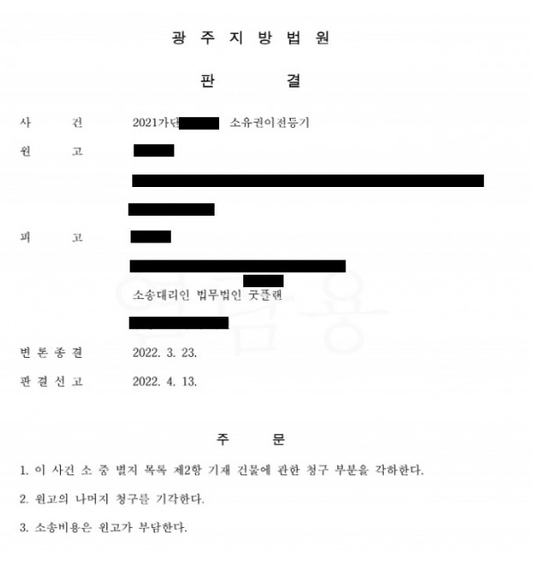 이 외에도 타당한 여러 주장들을 하여, 원고의 청구는 부당하는 것을 보여주었으며, 법원에 청구를 기각해달라고 요청하였습니다. 이에 법원은 원고의 모든 청구를 기각하였고, 소송비용 역시 원고가 부담하라고 하였습니다.