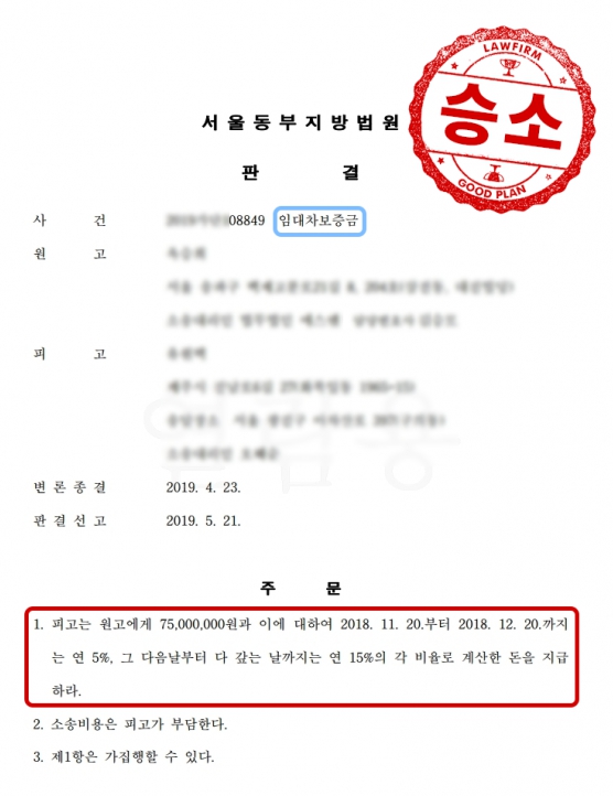 로펌 굿플랜은 임차인인 원고를 대리하여 임대인을 상대로 임대차보증금의 반환을 청구하였습니다.