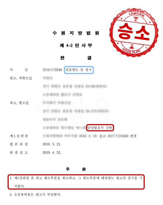 피고를 대리하여 변론한 결과, 항소심에서 “제1심판결 중 피고 패소부분을 취소하고, 그 취소부분에 해당하는 원고의 청구를 기각한다. 소송총비용은 원고가 부담한다.”라는 판결을 받아 ‘피고 전부 승소’하였습니다.