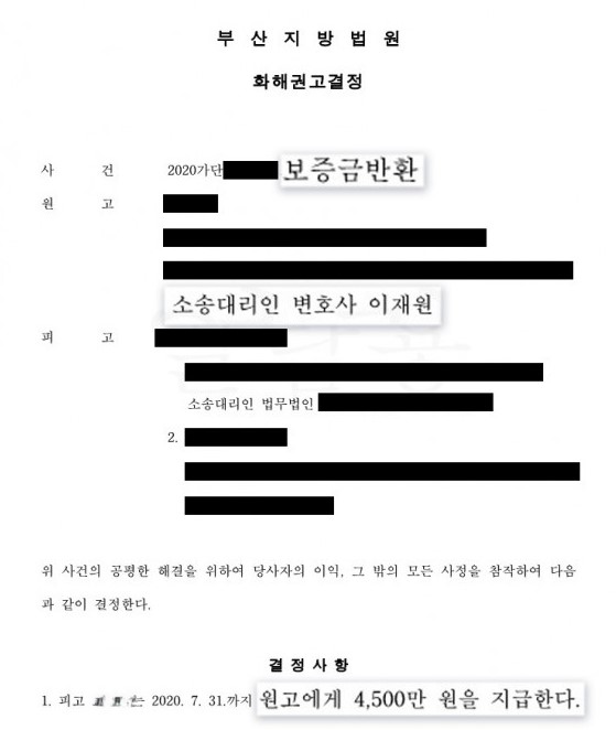 소송 결과, 피고는 원고에게 임대차 계약해지를 원인으로 한 임대차보증금의 반환과 지연손해금을 지급하는 합의를 도출하여, 이에 대한 재판부의 화해권고 결정을 받아 비교적 짧은 기간에 사건을 종결시킬 수 있었습니다.