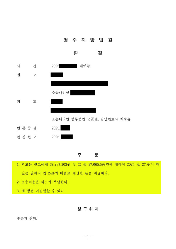 이에 원고는 기존 차용증에 따른 대여금 청구를 철회하고, 원고가 피고에게 빌려준 금원에 대하여 24% 이자를 적용해 3천 8백만 원을 지급하라고 주장을 선회하게 되었고, 재판부는 그 중 3천 7백만 원만 인정하였습니다.