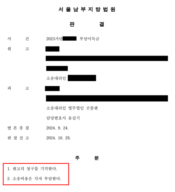 법원은 결국 굿플랜의 손을 들어주었으며, 원고의 청구는 기각되어 의뢰인은 전부 승소하게 되었습니다.