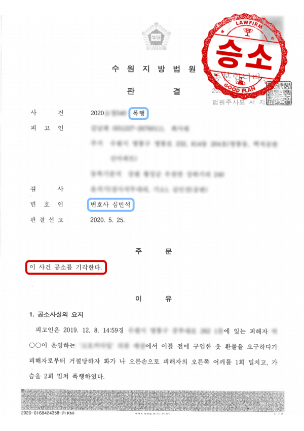 법무법인 굿플랜은 피고인을 변호하며 피해자와의 원만한 합의를 이끌어냈고, 합의서를 법원에 제출하여 공소가 기각될 수 있도록 도움 드렸습니다.