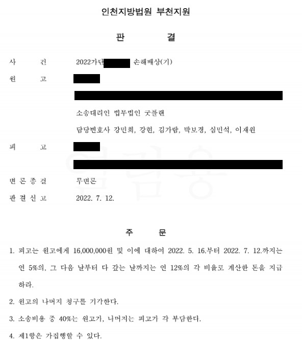 이에 재판부는 피고가 불법행위를 한 것이 맞고, 유부남인 것을 알고 만남을 지속해왔다는 점을 인정해 주어 아래와 같은 위자료를 지급하라는 판결을 내리게 되었습니다.