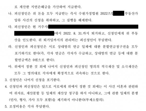 또한, 재산분할 금액을 정한 뒤 협의이혼을 진행하려 했으나, 갑자기 상대방 측에서 더 많은 재산분할액을 원한다고 하여 철회한 점도 보여주었습니다. 결국, 이러한 사유들로 인해 더 이상 혼인 관계를 유지할 수 없다는 것을 주장하였으며, 신청취지와 같은 조정 결정을 내려주기를 바란다고 하였습니다.