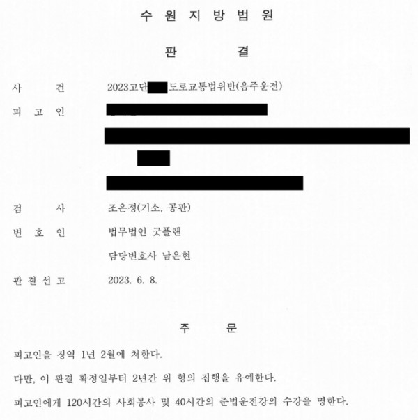 실형이 불가피한 상황처럼 보였으나, 굿플랜은 최대한 양형을 받을만한 자료들을 모으기 위해 노력하였습니다. 의뢰인의 반성문 및 주변 사람들의 탄원서, 음주운전 상담 및 프로그램 참여와 독후감 작성, 기부금 영수증 등을 제출하였으며, 결국 실형을 피할 수 있었고 원하는 결과를 받아 낼 수 있었습니다.
